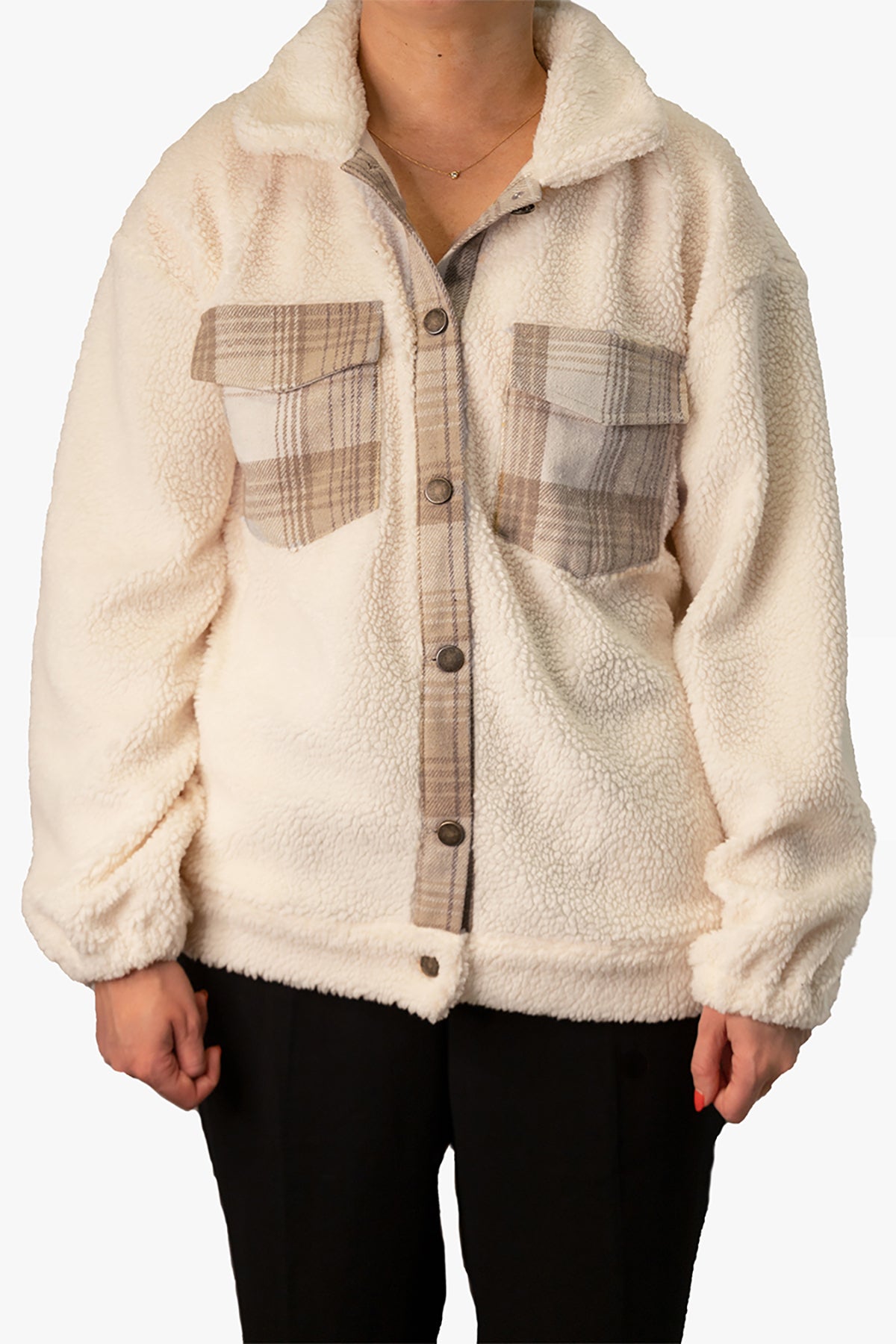 Get cozy and stylish with this snug shacket! Featuring a super stylish contrast plaid design, this shacket is the perfect blend of comfort and fashion. It comes with two front flap pockets, two side pockets, and a button-up closure for added convenience.
