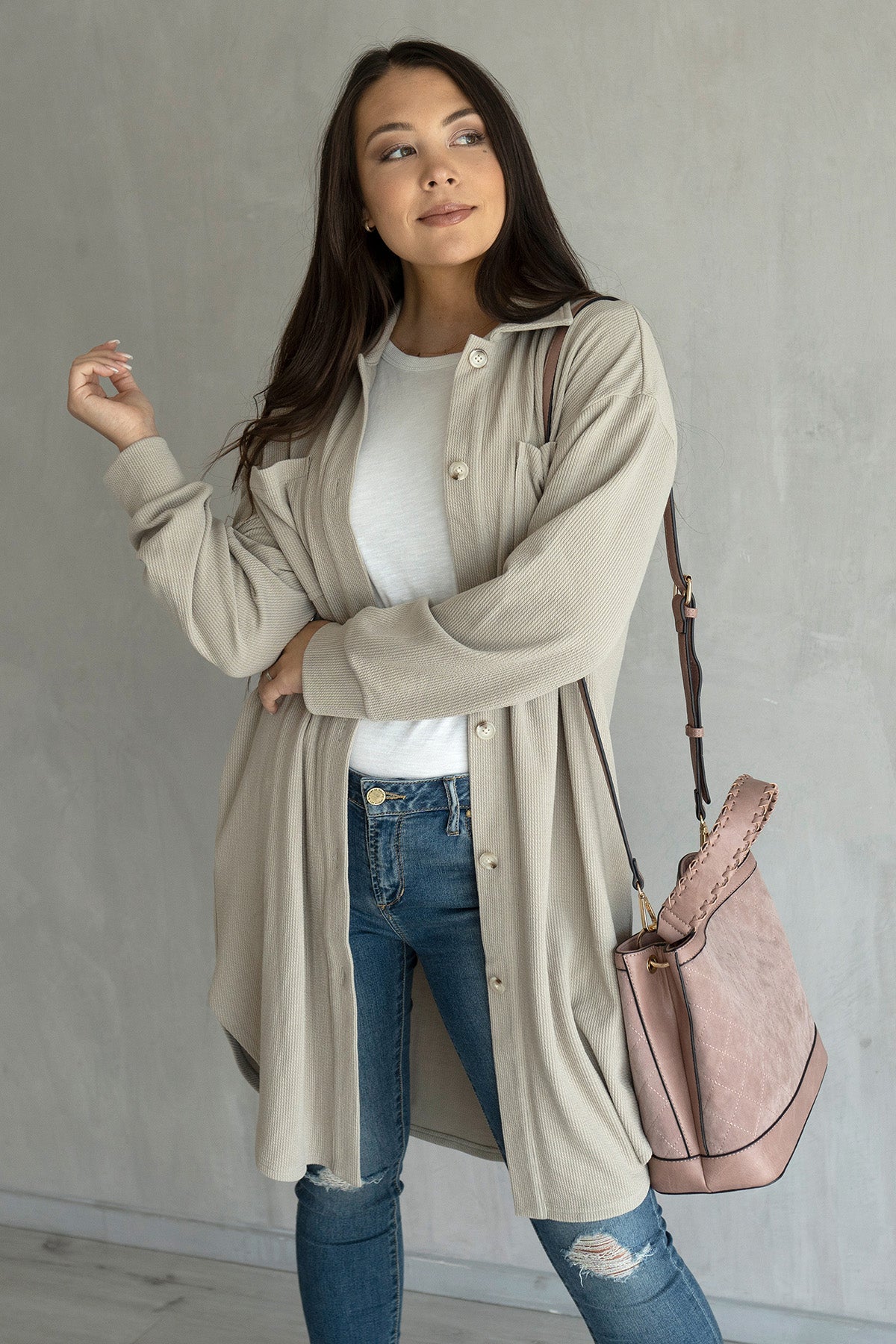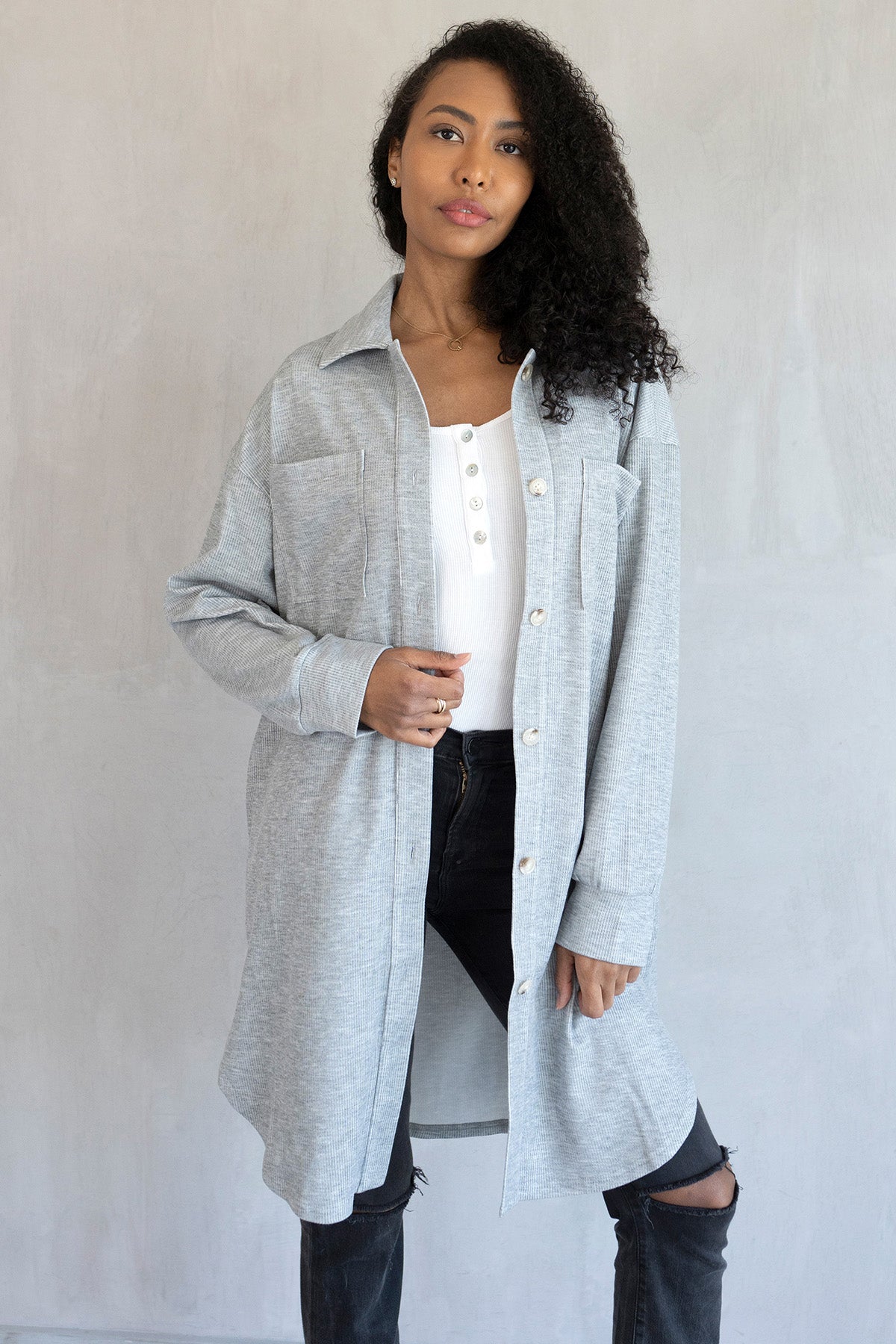 This long, knit style can be worn as a jacket or as a dress! It features a tortoiseshell button closure and two patch pockets. 95.4% polyester, 4.6% spandex. Our model Kristina is 5'9" and is wearing a small/medium. Small/Medium: 0 - 6; Large/XLarge: 8 - 14; 2XL/3XL: 16 - 20