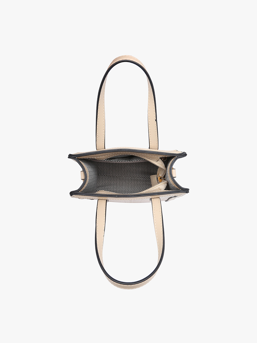 Introducing Emmie, a stylish rectangular snake-textured satchel that you're sure to love! This versatile bag can be carried by its vegan leather handles or worn as a crossbody with the adjustable and removable strap. Made of textured vegan leather, Emmie is both fashionable and cruelty-free.
