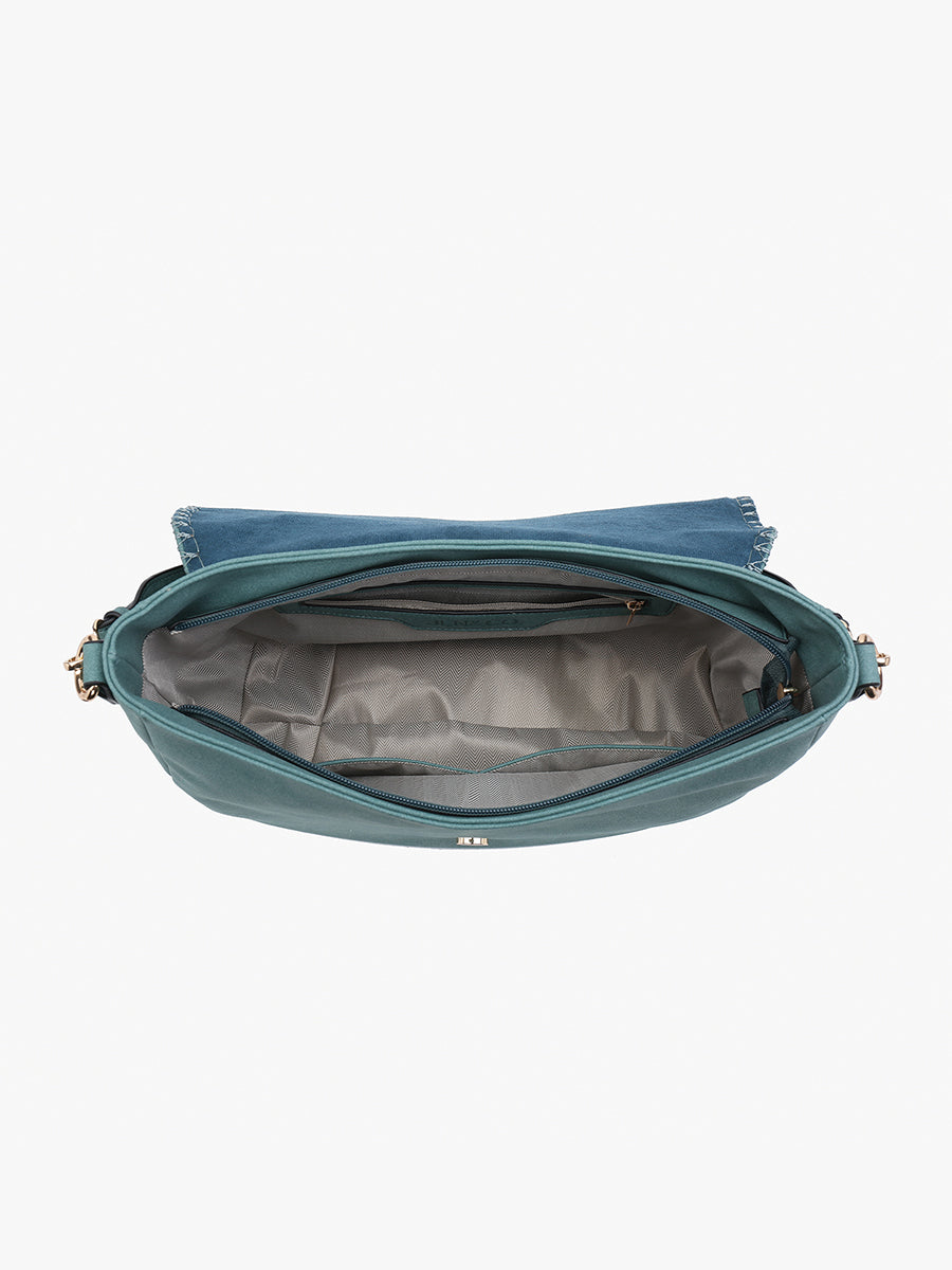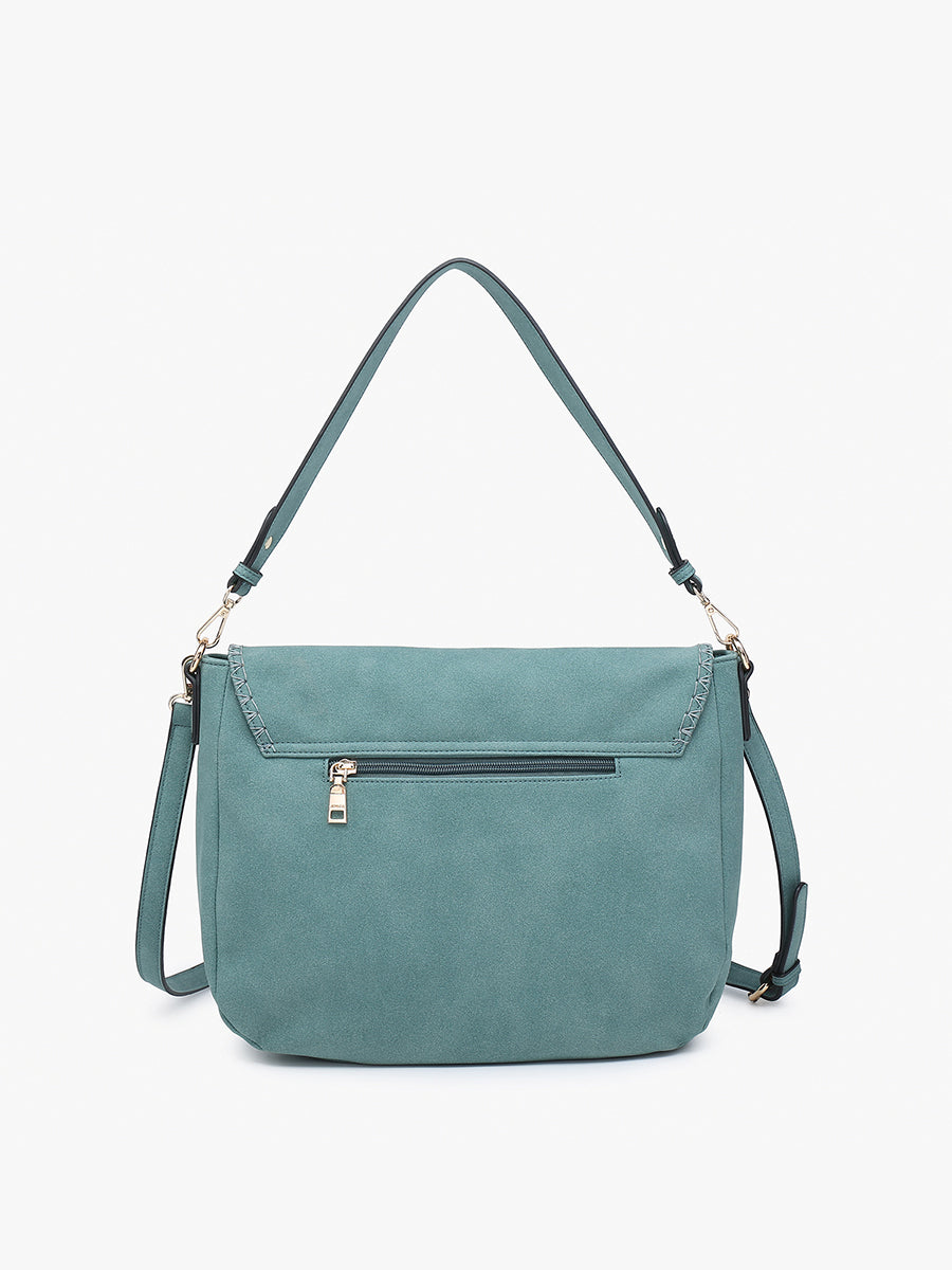 Shop now and add the Jess Faux Suede Satchel with Whipstitch Flapover to your collection for a stylish and functional accessory!