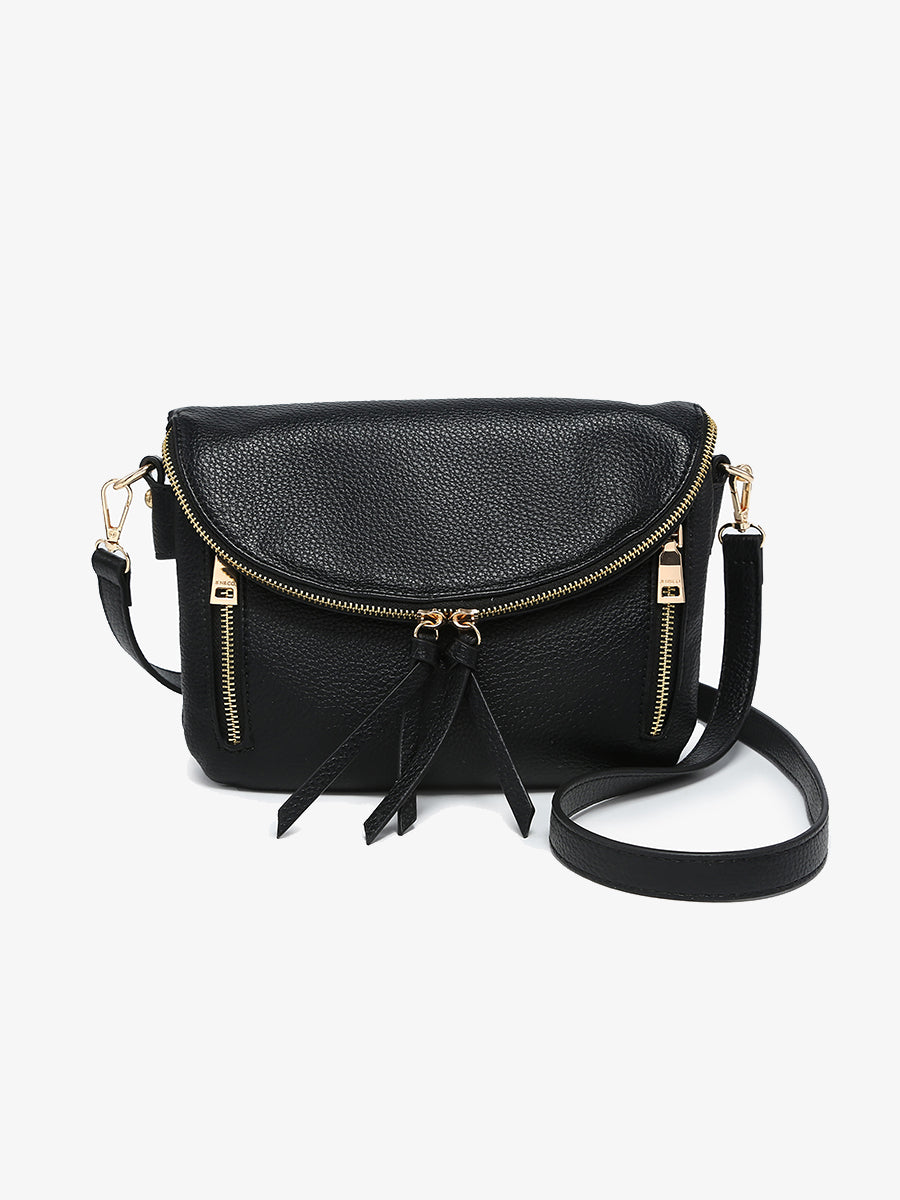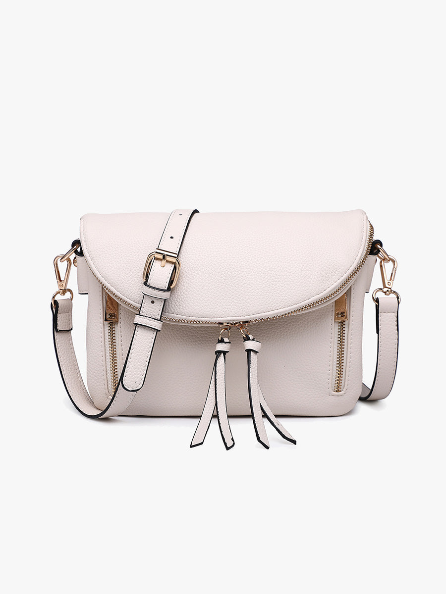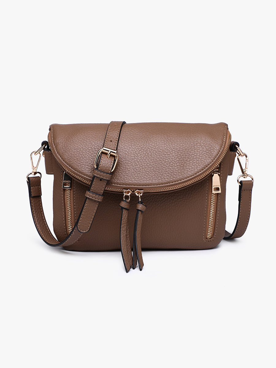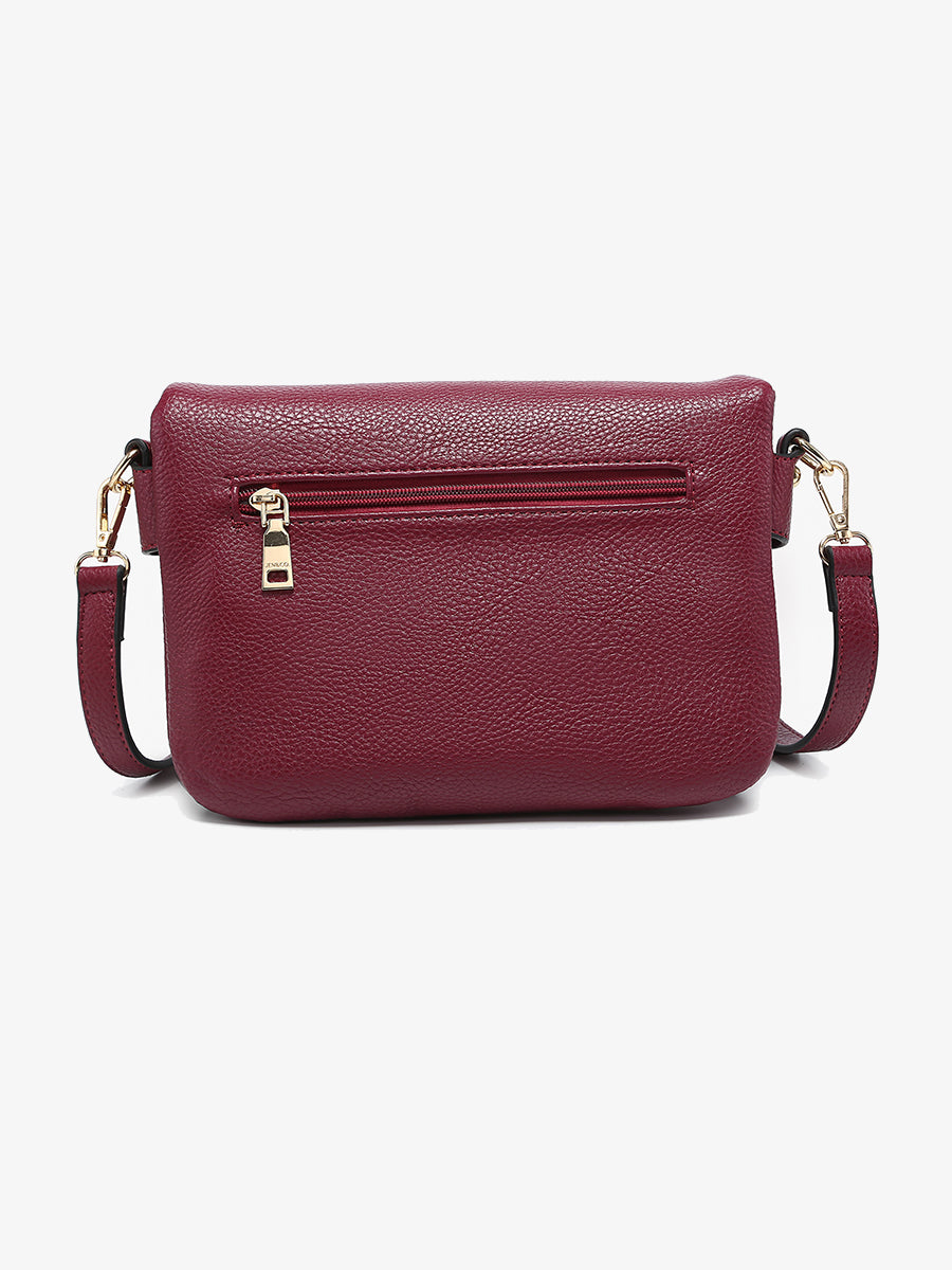 The Aubree Flapover Crossbody Bag is designed for ultimate organization with three separate compartments, including dual front zip pockets and a back zip pocket. It features both snap and zip closures for added security and style, plus an adjustable and removable crossbody strap for versatile wear.