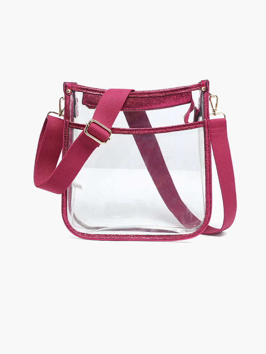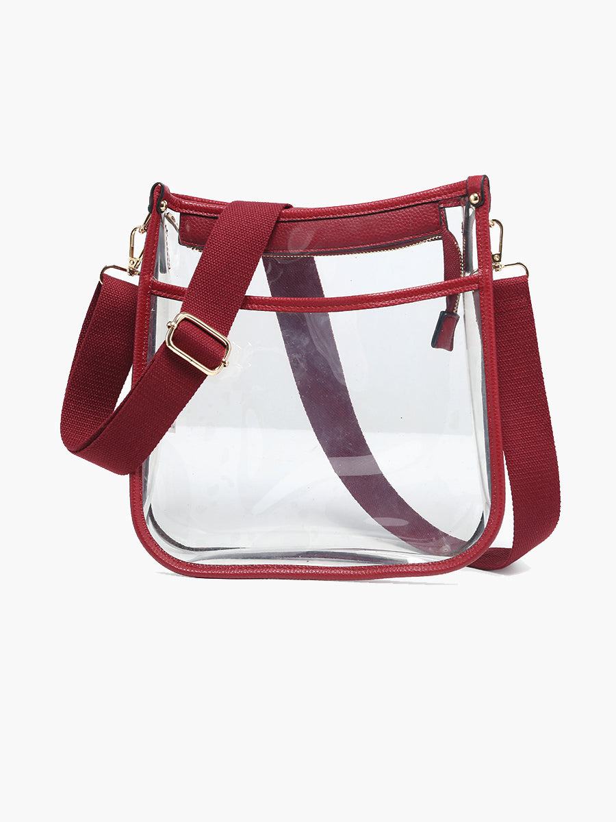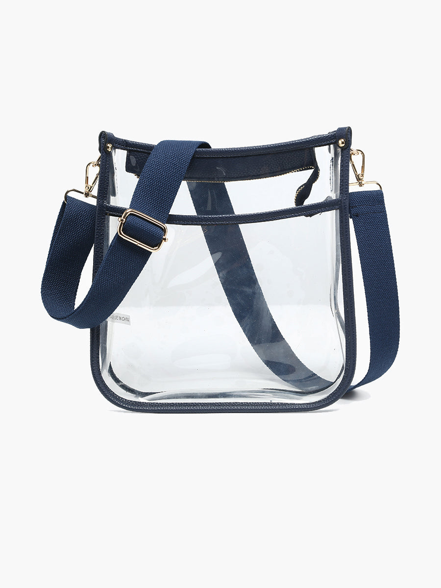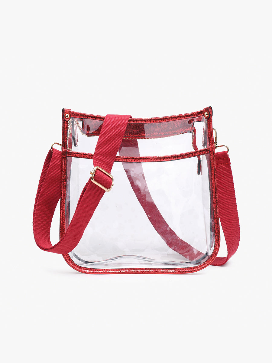 Introducing Posie, a compact rendition of our beloved Chloe design, perfect for your on-the-go lifestyle! This clear version is ideal for game day outings, allowing you to showcase your essentials effortlessly. Posie features a convenient top zipper closure and a front open pocket for easy access to your belongings. Complete with a matching adjustable and detachable guitar strap, Posie offers versatility in styling. Its trim is crafted from vegan leather, ensuring a cruelty-free accessory choice. With dimensions measuring 10"L x 10"H x 2.5"D, Posie combines practicality with contemporary style.