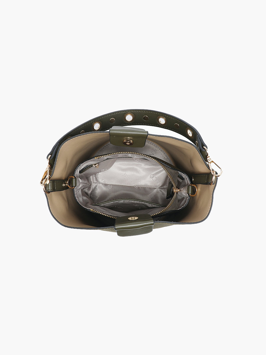- Classic bucket silhouette with secure snap closures