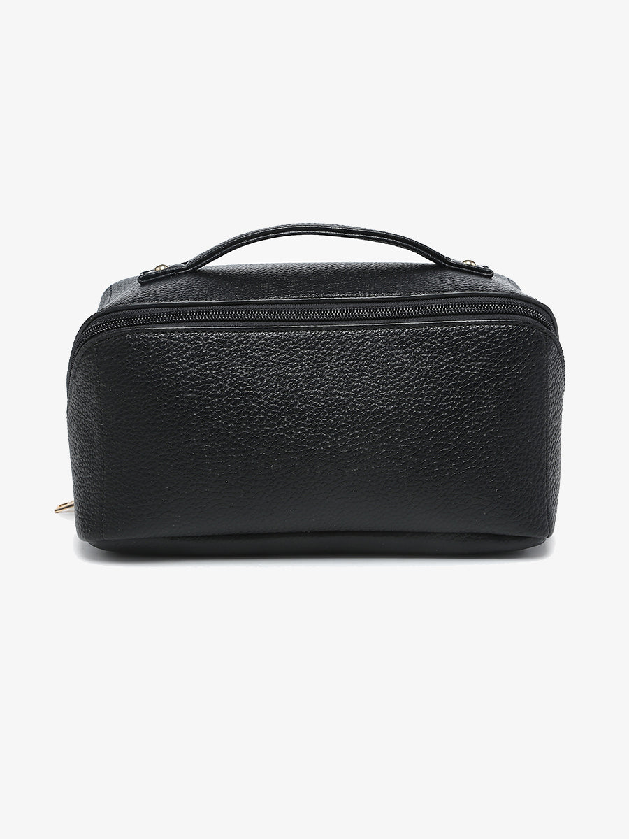 The Paxton Travel Makeup Bag is a sleek, functional organizer designed to keep beauty essentials neatly arranged. Multiple compartments, including a clear center zip pocket, provide easy access and visibility while keeping everything secure and organized.