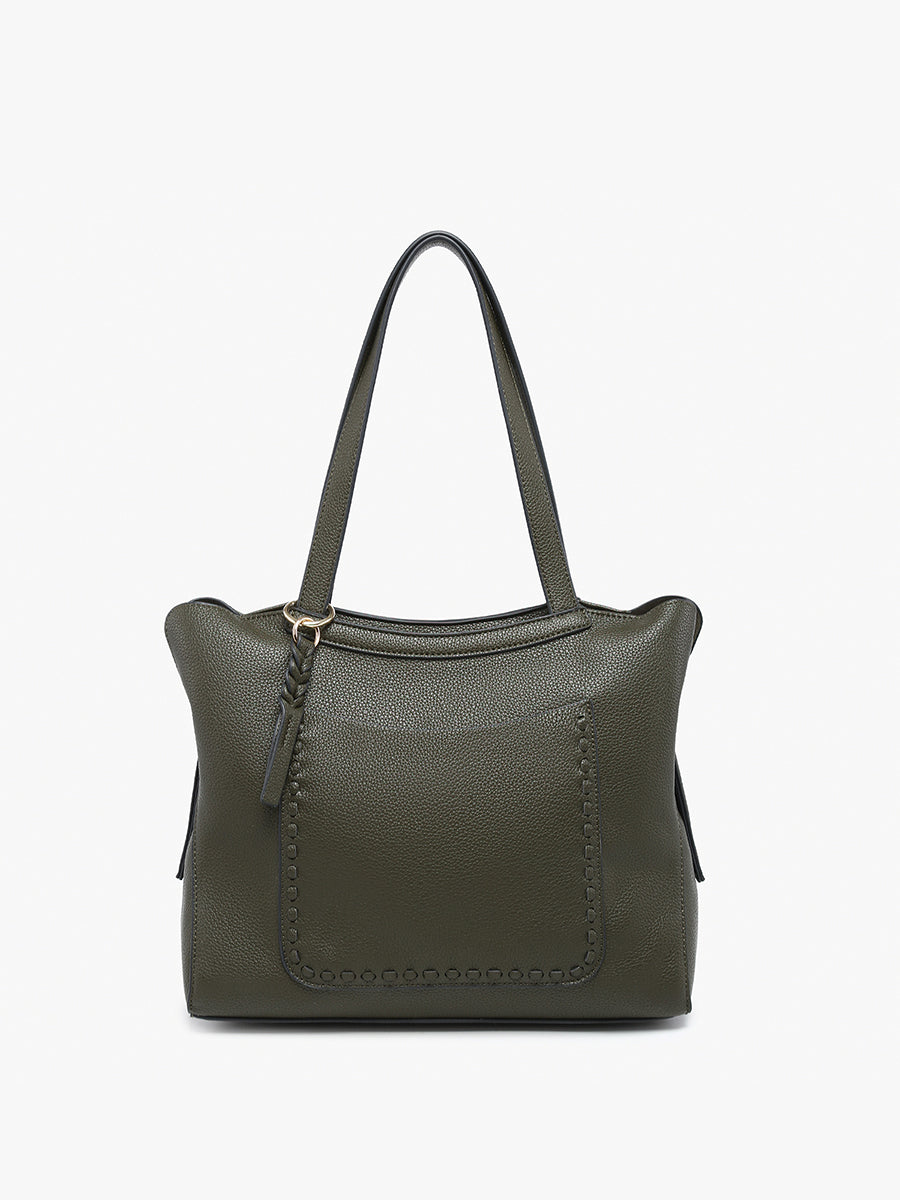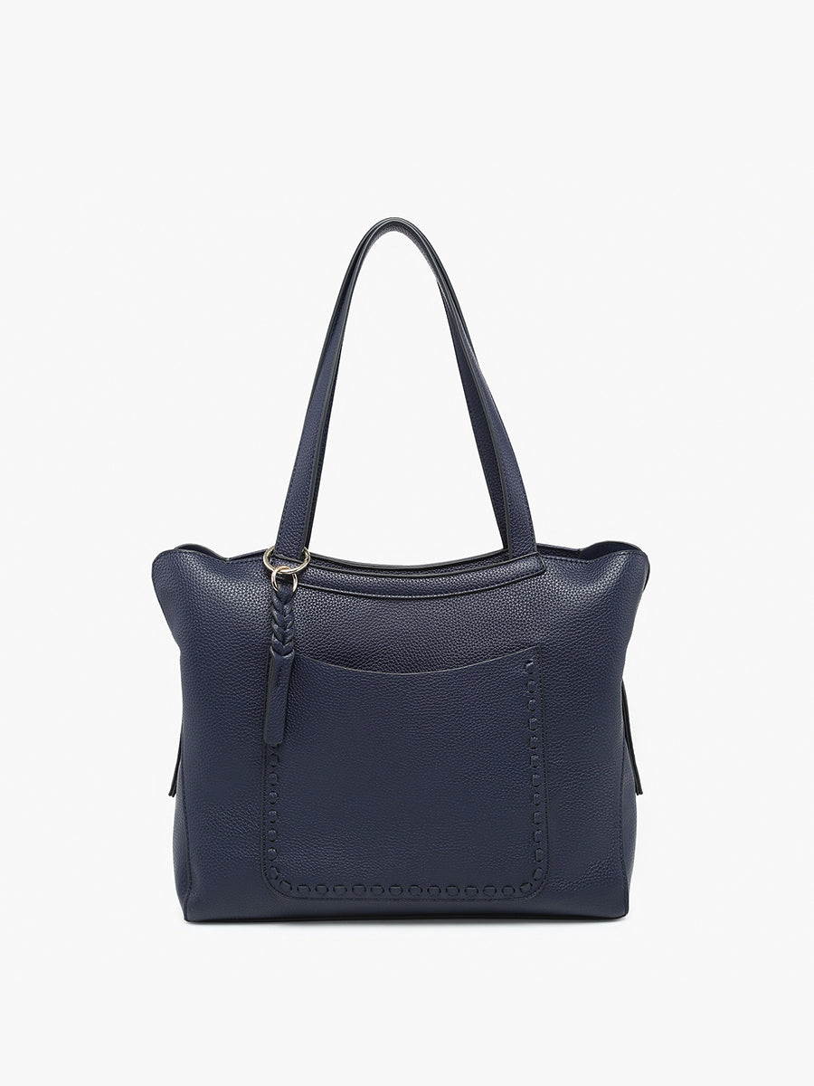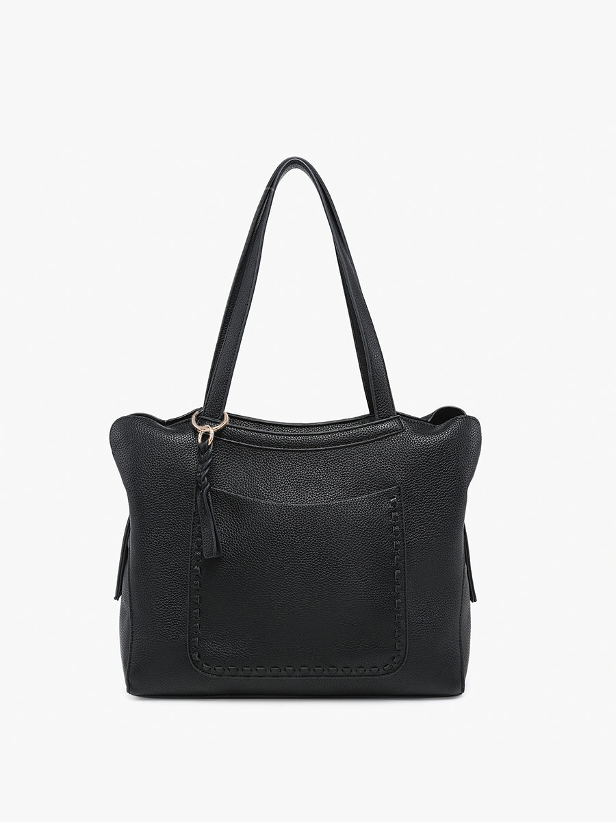 The Hunter Pocket-Front Distressed Tote offers a rugged yet stylish look with its distressed fabric construction. Featuring a secure top zip closure and a unique whipstitch front slip pocket, this tote combines fashion and functionality. A removable braided bag charm adds a touch of personalization, while an inner pouch provides additional storage for your essentials.