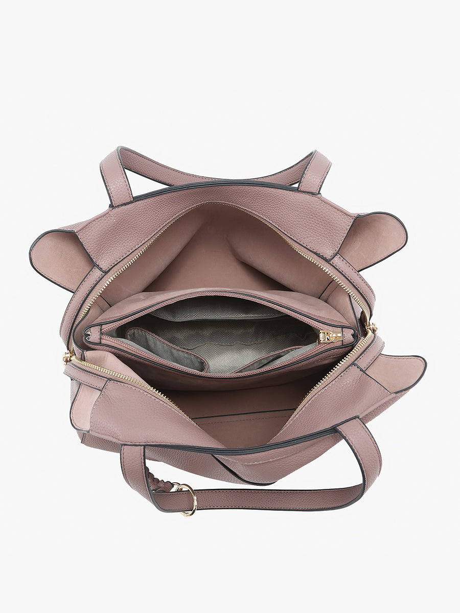 • Removable braided bag charm for a personalized touch.