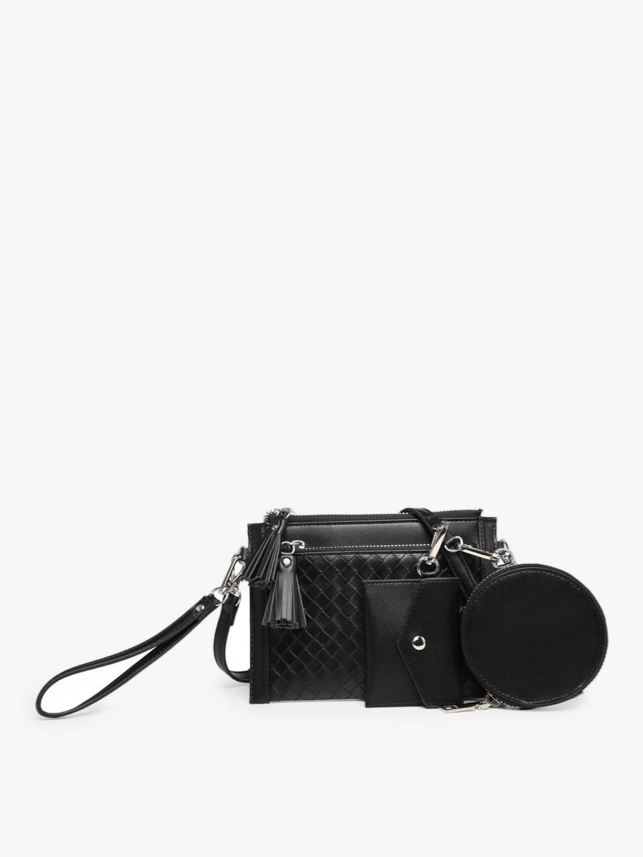Meet Mirabel, the versatile bag full of options! Crafted with a distinctive weave-textured design, Mirabel offers functionality and style in one chic package. This bag comes with multiple coin pouches that can be easily removed or attached anywhere you desire, allowing for customizable organization. Mirabel features two zippered compartments adorned with fringe tassels, convenient inside cardholders, a practical wristlet strap, and an adjustable/detachable crossbody strap for versatile carrying options. Made of durable vegan leather, Mirabel is as sustainable as it is fashionable. Dimensions: 7.5"L x 5.5"H x 1"D.
