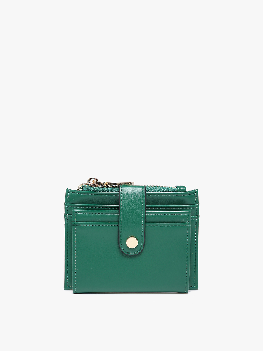 Meet Sam, one of our best-selling small wallets designed for functionality and style! This compact accessory is perfect for those who value convenience and organization. Sam boasts plenty of card space, allowing you to keep your essentials neatly organized. The snap closure ensures that your cards stay securely in place. The card/ID holder conveniently folds out for easy access, while the top zipper closure adds an extra layer of security to your belongings. Adorned with gold-tone hardware, Sam exudes elegance and sophistication. Crafted from luxurious vegan leather, it offers both durability and ethical style. With dimensions measuring 5"L x 4"H, it's perfectly sized to slip into any handbag or pocket.