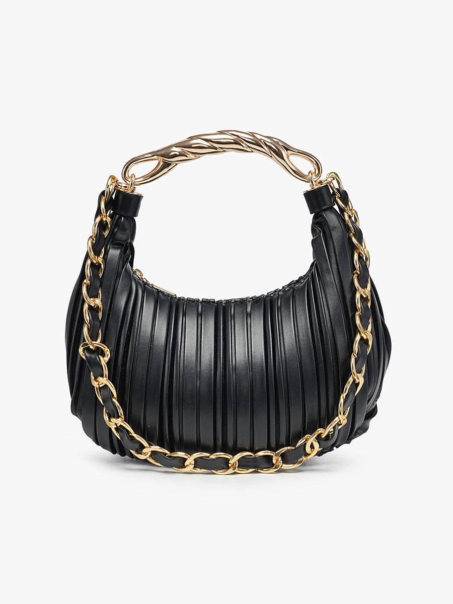 Soft pleating and refined hardware define the Miriam Shoulder Bag. Designed with a top zip closure, it features a sculptural metal-textured handle and a removable chain vegan leather strap.