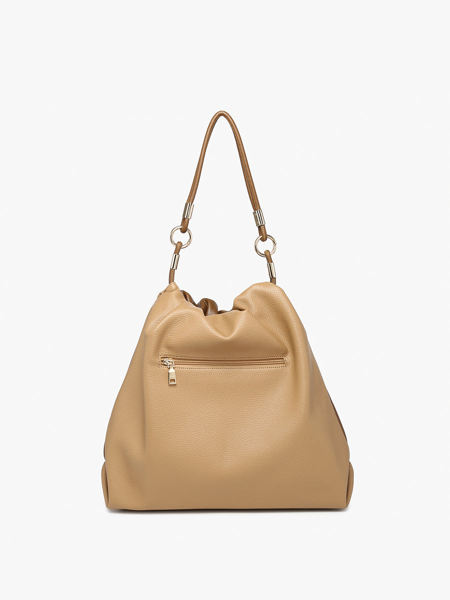 The Noelle Two-Tone Ruched Hobo is a stylish and spacious accessory, crafted from premium vegan leather. Featuring a trendy slouchy, ruched design and a two-tone finish, this hobo bag stands out with its unique chain-detail strap and metal hardware accents. The zip closure and back zip pocket offer secure and convenient storage, making it both fashionable and functional.