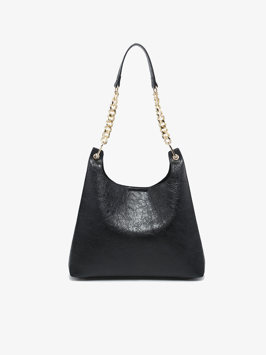 • Chain shoulder strap with snap closure for secure, stylish wear