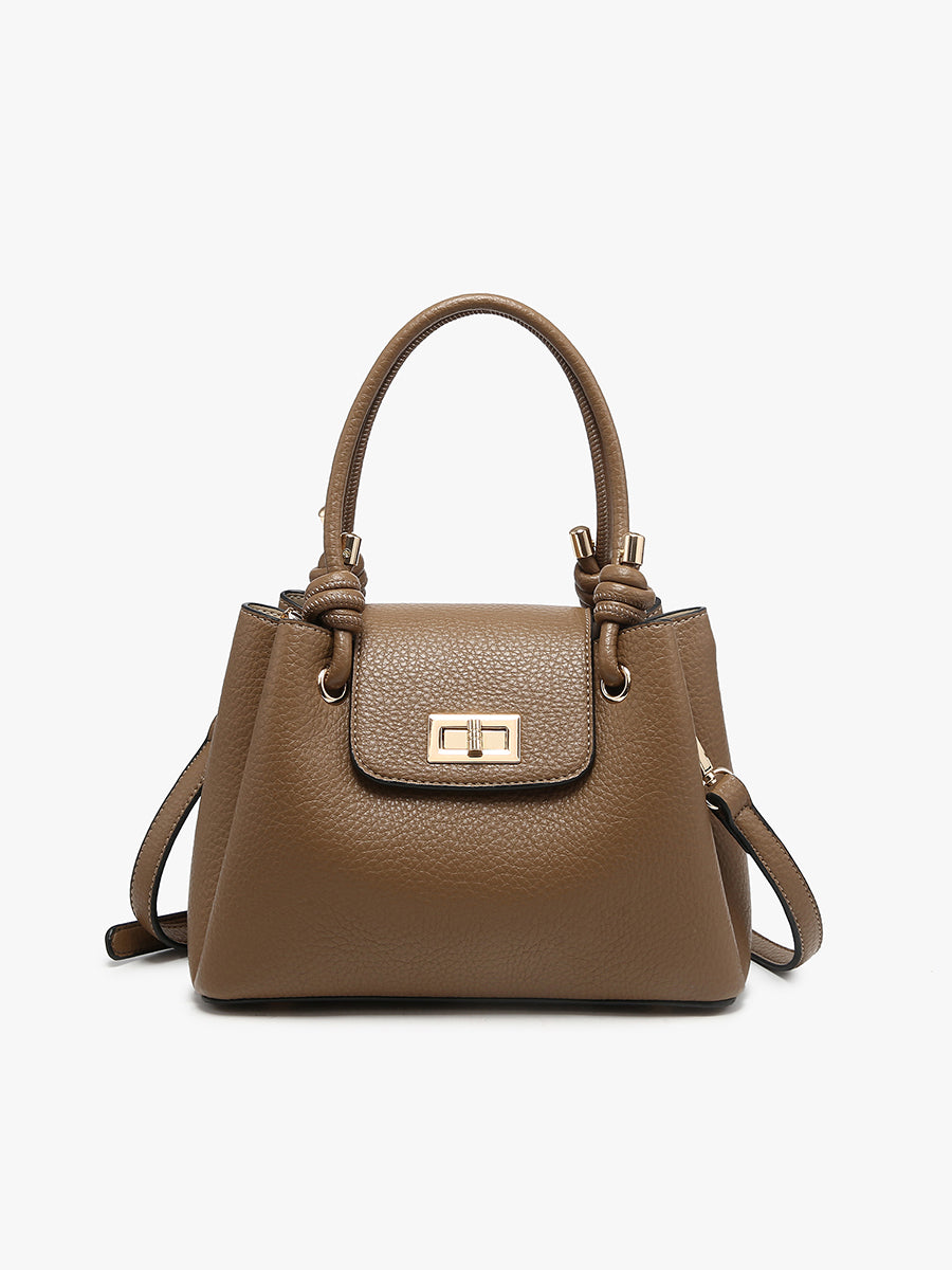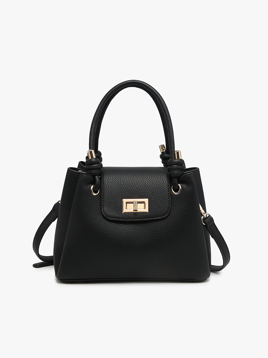 The Zoey Satchel brings refined structure to a classic silhouette. Designed with three compartments and a twist-lock closure, it offers elevated organization and style. The bag has an interior zip compartment and slip pocket for easy organization. Carry by its twisted dual handles or its removable crossbody strap.