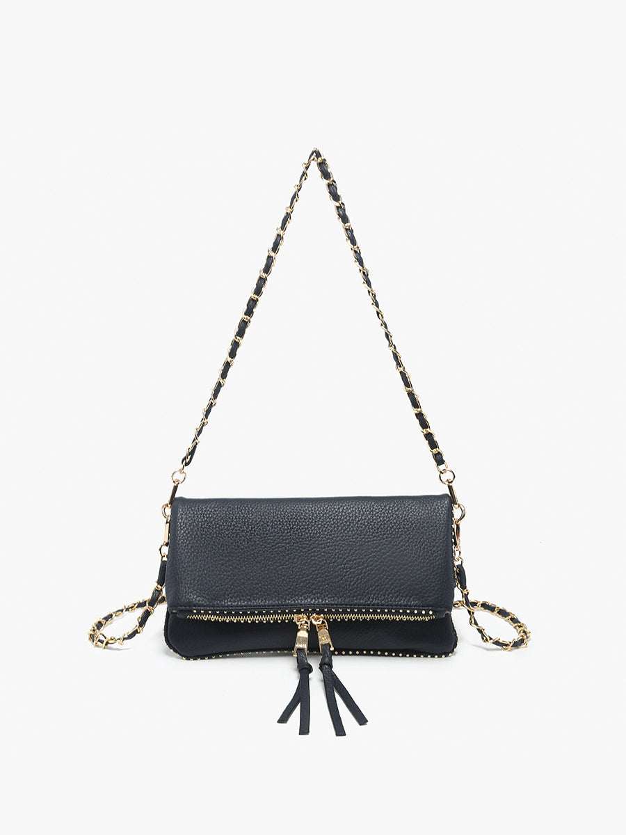 - Flappover crossbody with intricate studded trim detailing for edgy sophistication.