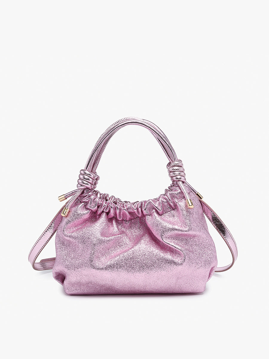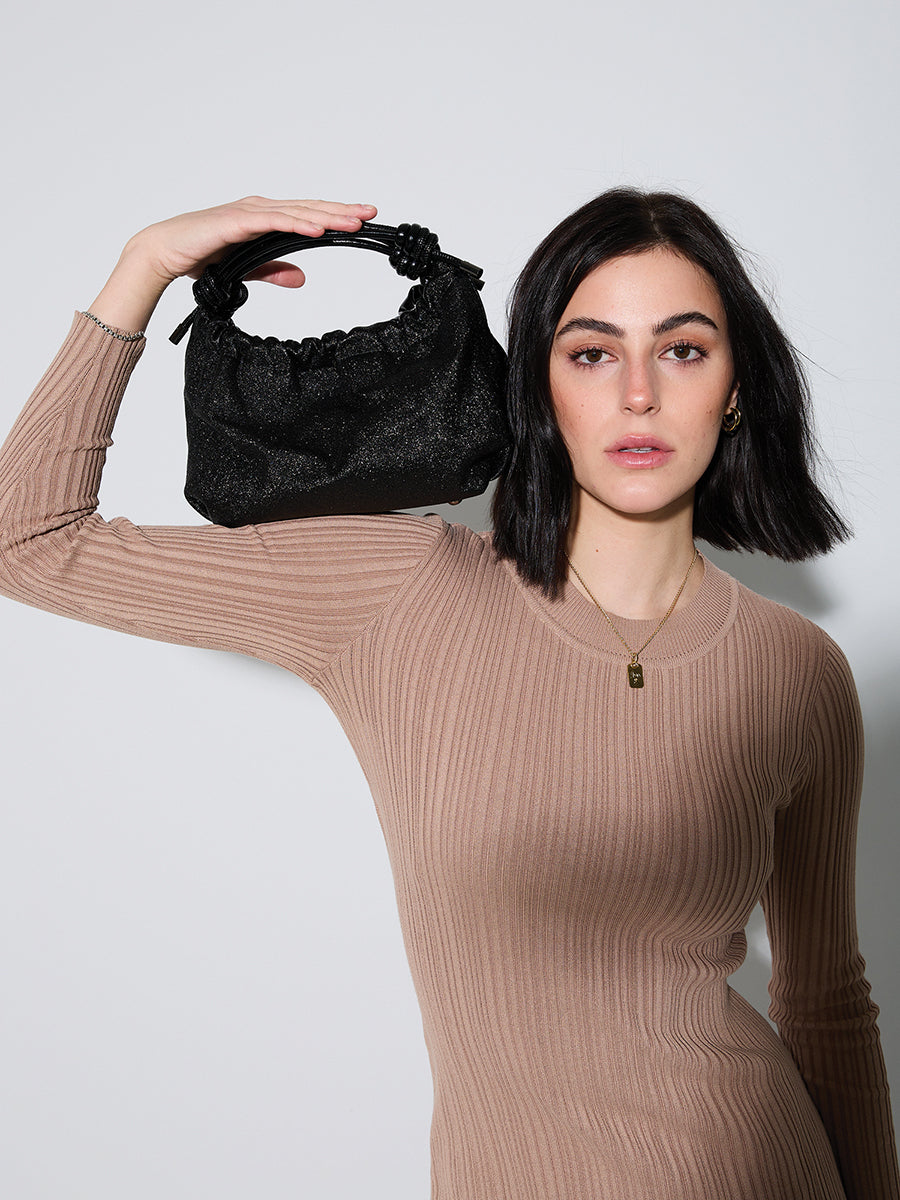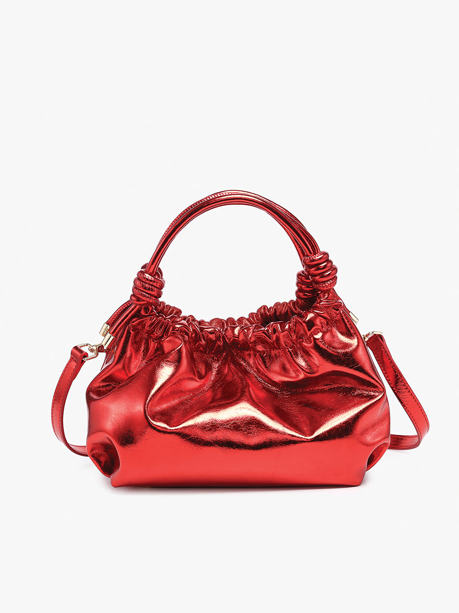 The Lennox Glitter & High Gloss Ruched Clutch Crossbody is a statement piece designed to elevate any outfit. With its glittery, high-gloss finish and ruched design, this clutch crossbody exudes elegance and flair. The knotted top handles add a stylish twist, while the adjustable/removable crossbody strap offers versatility.