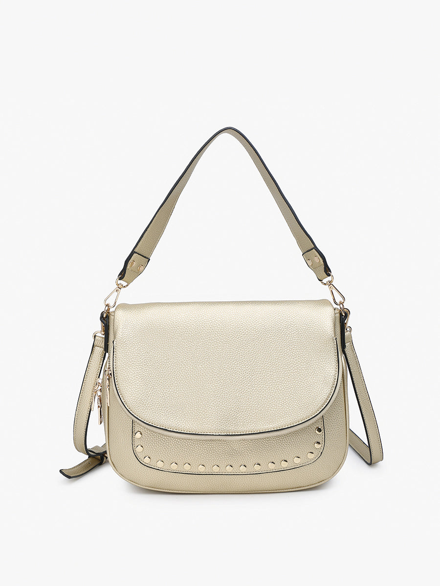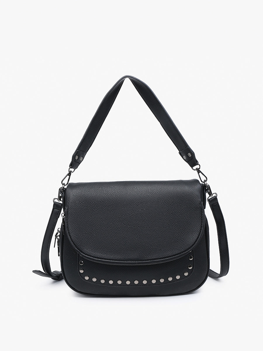 Introducing the M2505 Monet Crossbody/Messenger with Stud Details. This stylish saddle bag features durable fabric with eye-catching stud and grommet details. Perfect for both casual and dressy occasions, it offers a blend of practicality and flair.