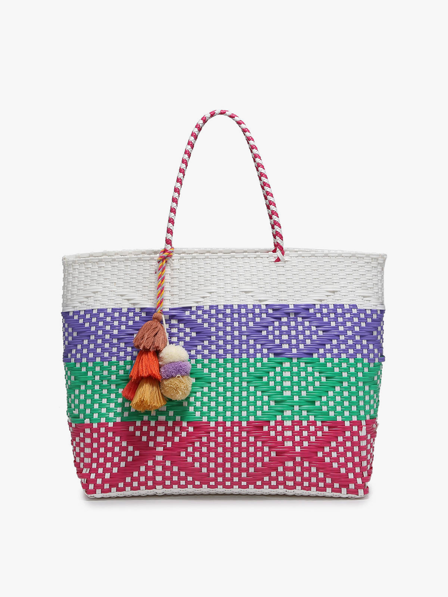 Introducing the Allie Woven Tote, a delightful fusion of style and functionality. This oversized basket-style tote crafted from woven plastic exudes coastal charm with playful pom-pom accents. Whether you're heading to the beach or running errands, Allie offers ample space for all your essentials and more, ensuring you're prepared for any adventure.