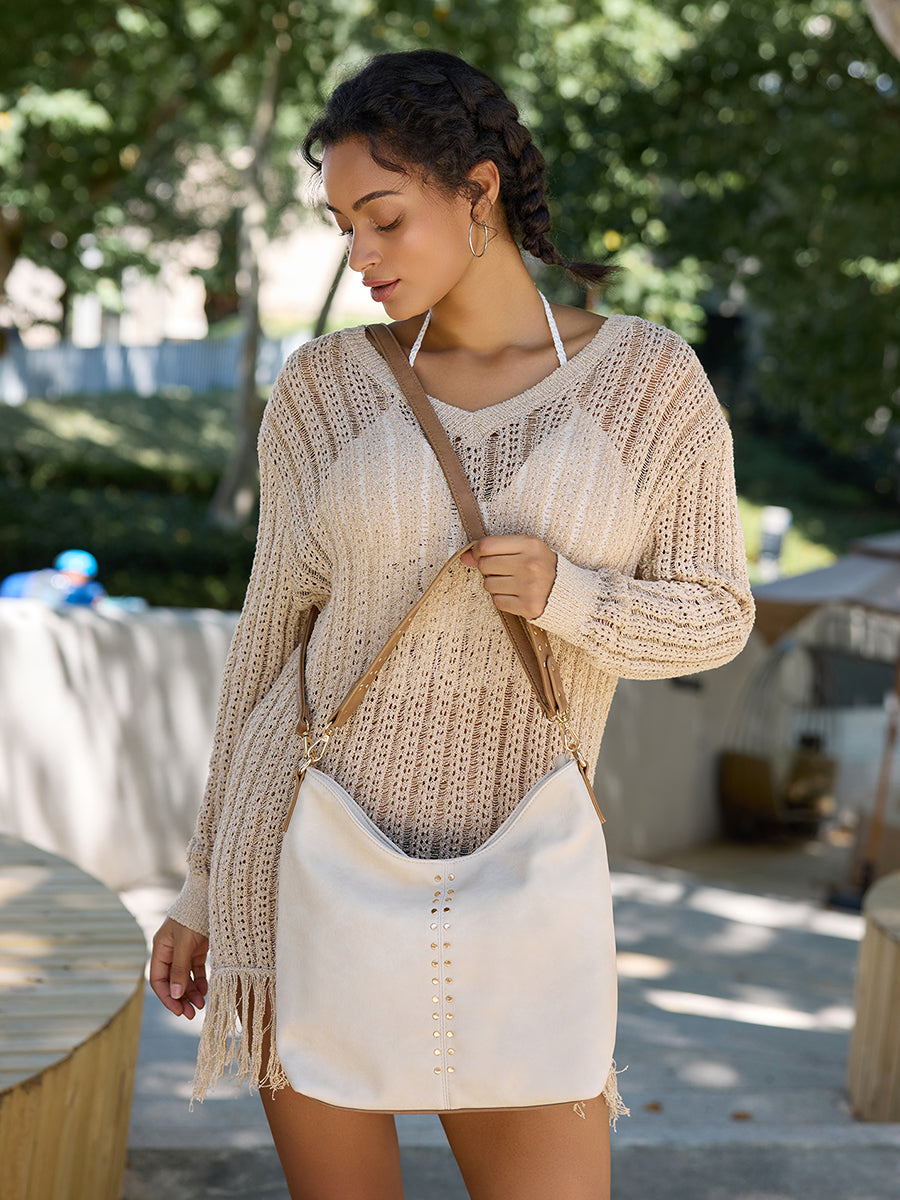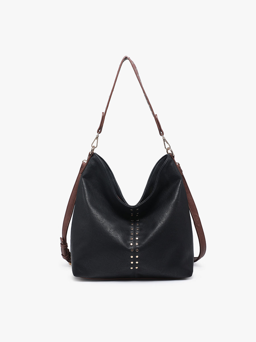 The Emery Hobo Bag combines a relaxed, modern silhouette with edgy front stud detailing. A top