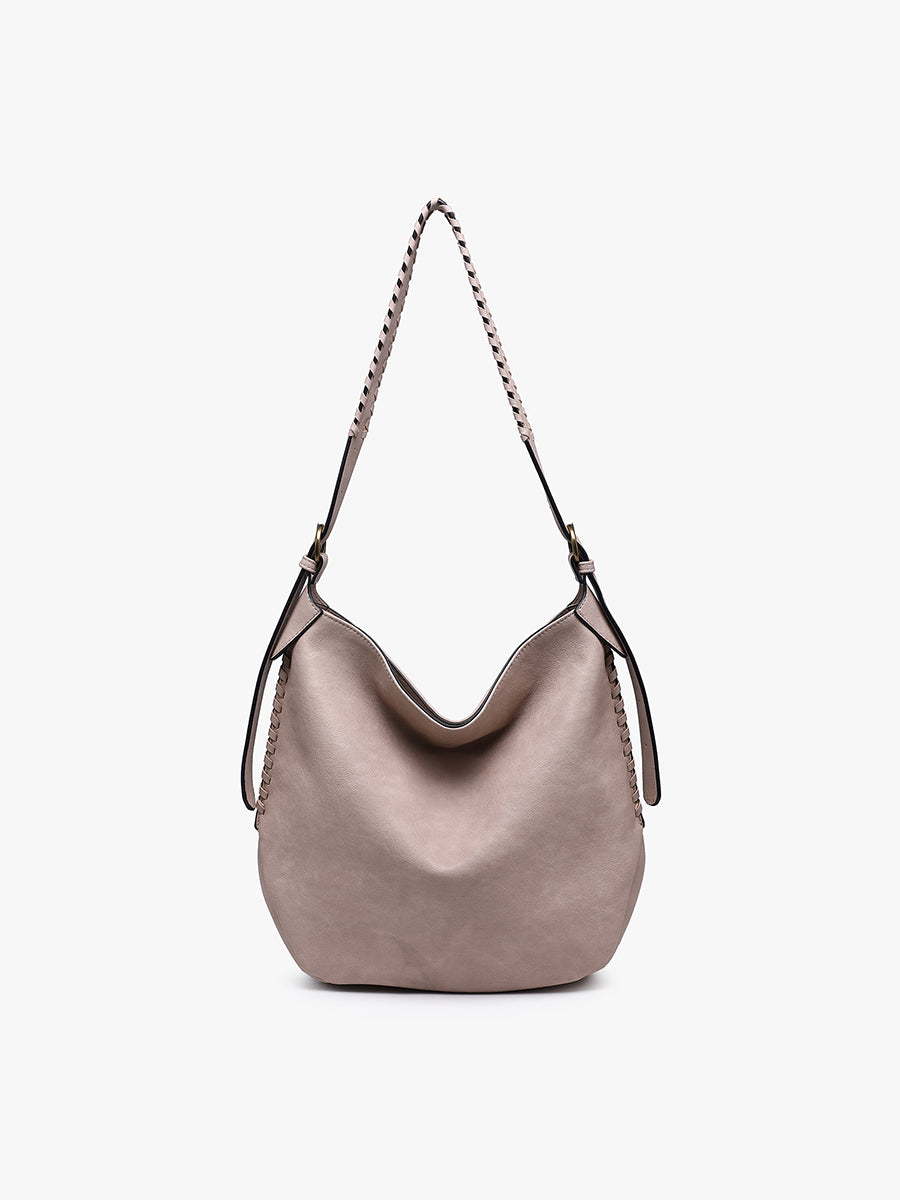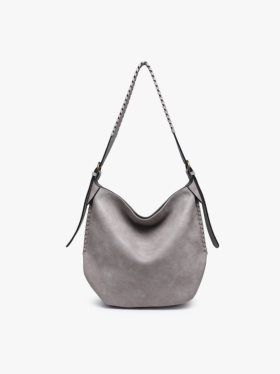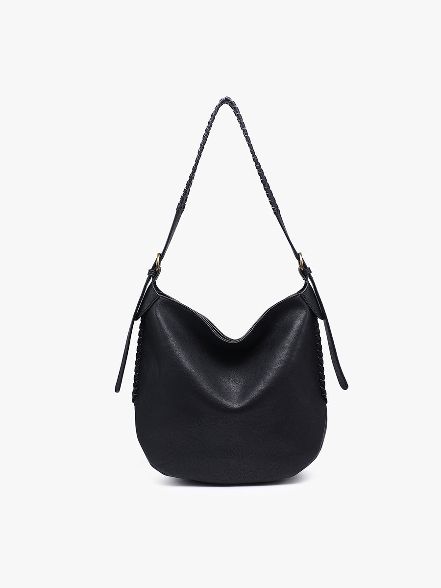 The Madelyn Hobo Bag offers a chic, handcrafted look with whipstitch trim and a classic silhouette. A top zip closure keeps belongings secure, while a back zip pocket provides easy-access storage. The adjustable whipstitch shoulder strap ensures comfortable, customized wear, making it perfect for everyday use.