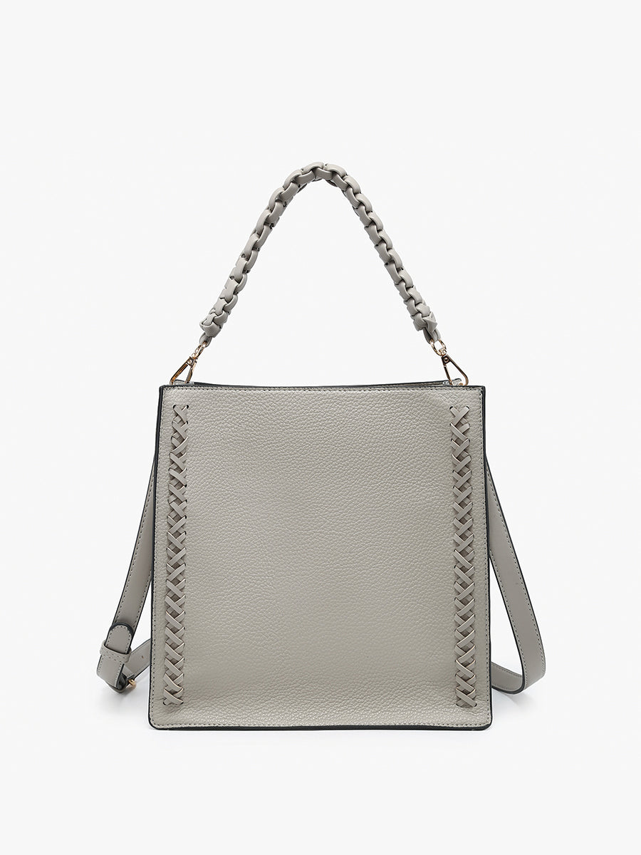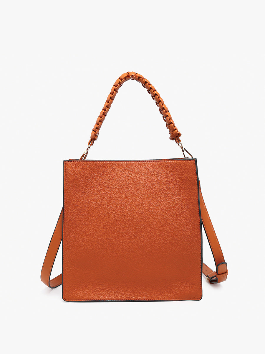 Removable braided handle and adjustable, removable crossbody strap for versatile wear.