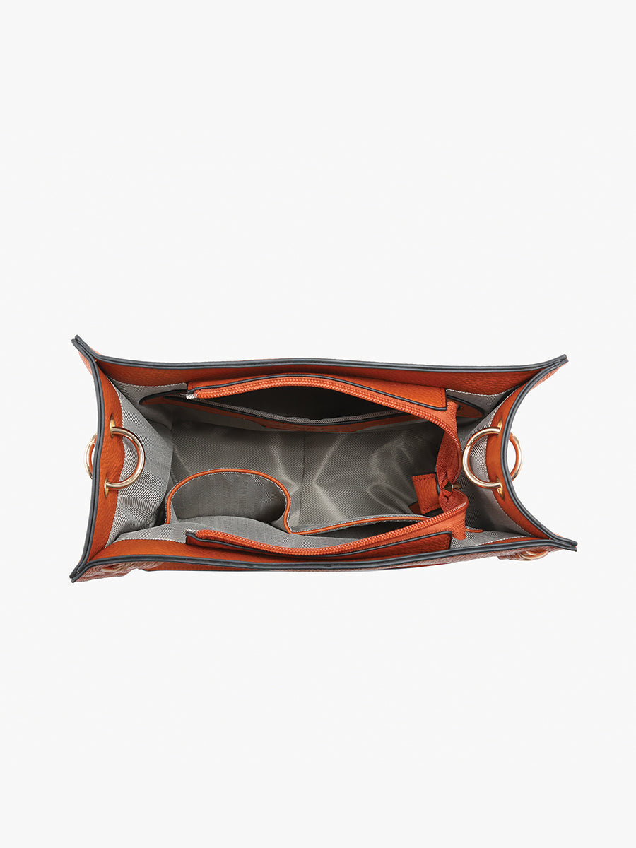 The Esme Whipstitch Detail Tote combines chic design with versatile functionality, crafted from premium vegan leather. This square tote features a stylish front whipstitch design and a secure top zip closure. It comes with a removable braided handle and an adjustable, removable crossbody strap, offering multiple carrying options for a modern and practical accessory.