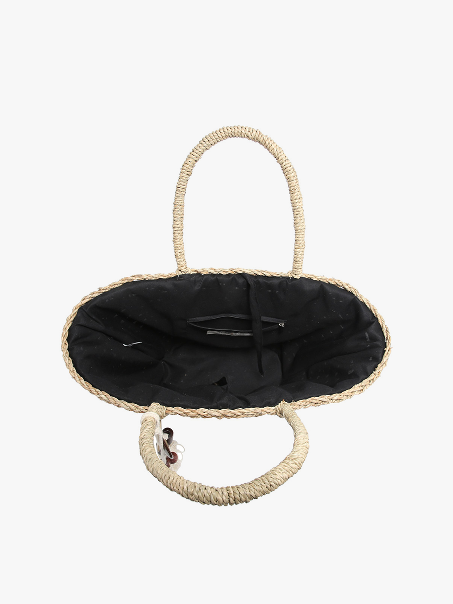 • Wood-detailed tassel: Enhances the tote's rustic charm.