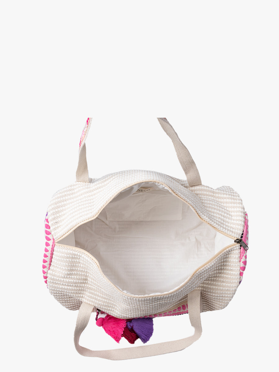 Elevate your style with our vibrant woven tote, featuring a stunning contrast print and charming matching tassels. Crafted from high-quality cotton, this tote exudes a sense of bohemian flair while offering practicality and durability. The tote zips closed, providing added security for your belongings while you're on the move. With its eye-catching design and spacious interior, it's the perfect accessory for any outing.
