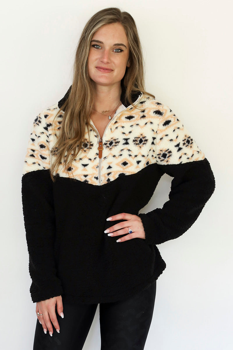 The Kate Sherpa Pullover combines comfort and casual style. Its half-zip front, side pockets, and soft printed sherpa make it a perfect pullover for layering and everyday wear.