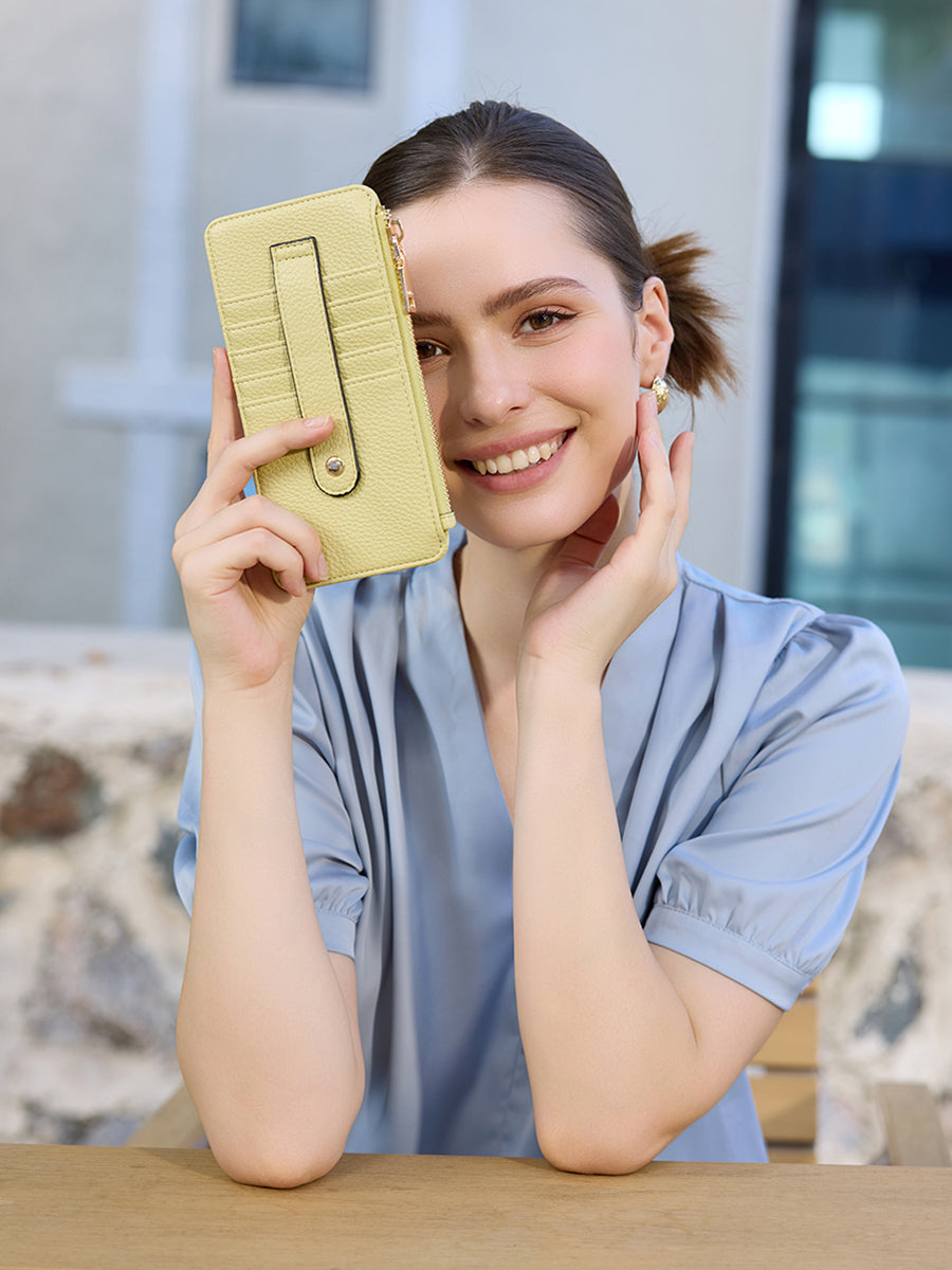 The Saige RFID Slim Card Holder Wallet combines sleek style with practical organization. Crafted from vegan leather with gold-tone hardware accents, it features a zippered coin pouch and ID holder, keeping essentials secure and easily accessible.
