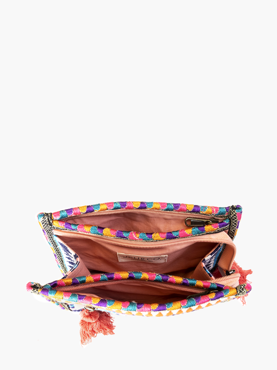Introducing Emberlyn, the ultimate travel companion! This woven, patterned pouch is designed to make your travels easier and more organized. With three zip-closed compartments and a convenient zipper pocket on the front, Emberlyn ensures that all your essentials are secure and easily accessible.