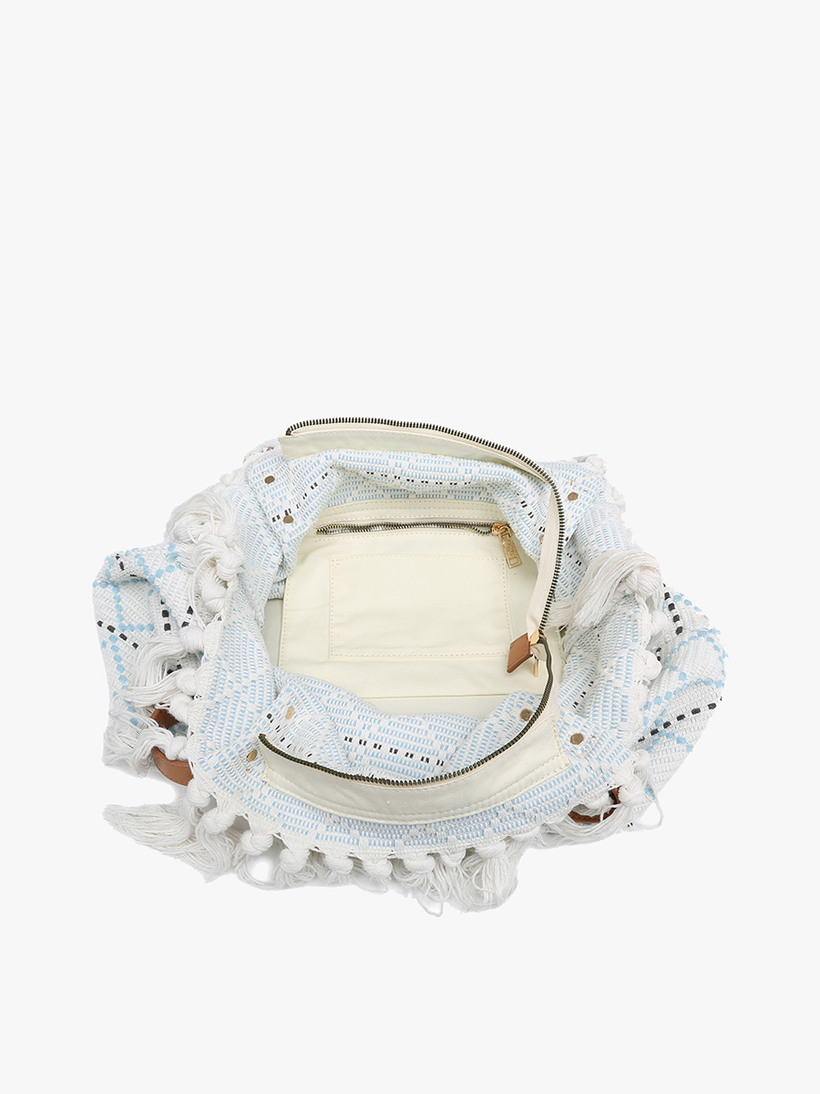 - Beautifully woven tote with fringe edges and vegan leather accents.