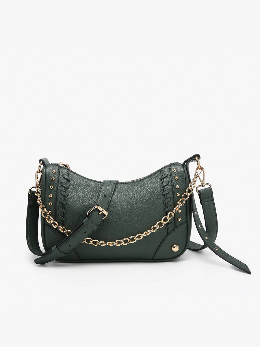 The Artemis Paneled Crossbody combines edgy style with functionality, featuring whipstitch and stud detailing. Complete with a top zip closure and an adjustable, removable chain strap, this crossbody offers a versatile and modern look.