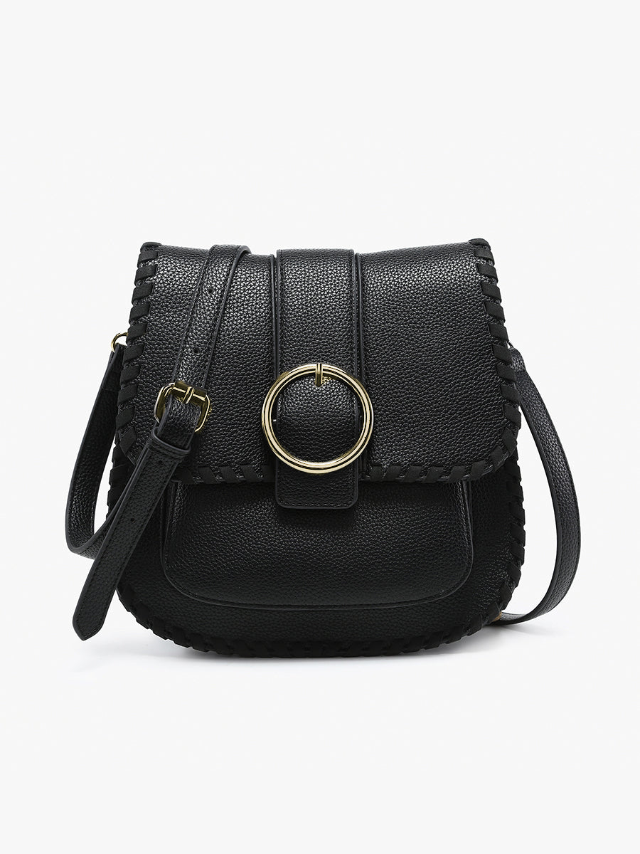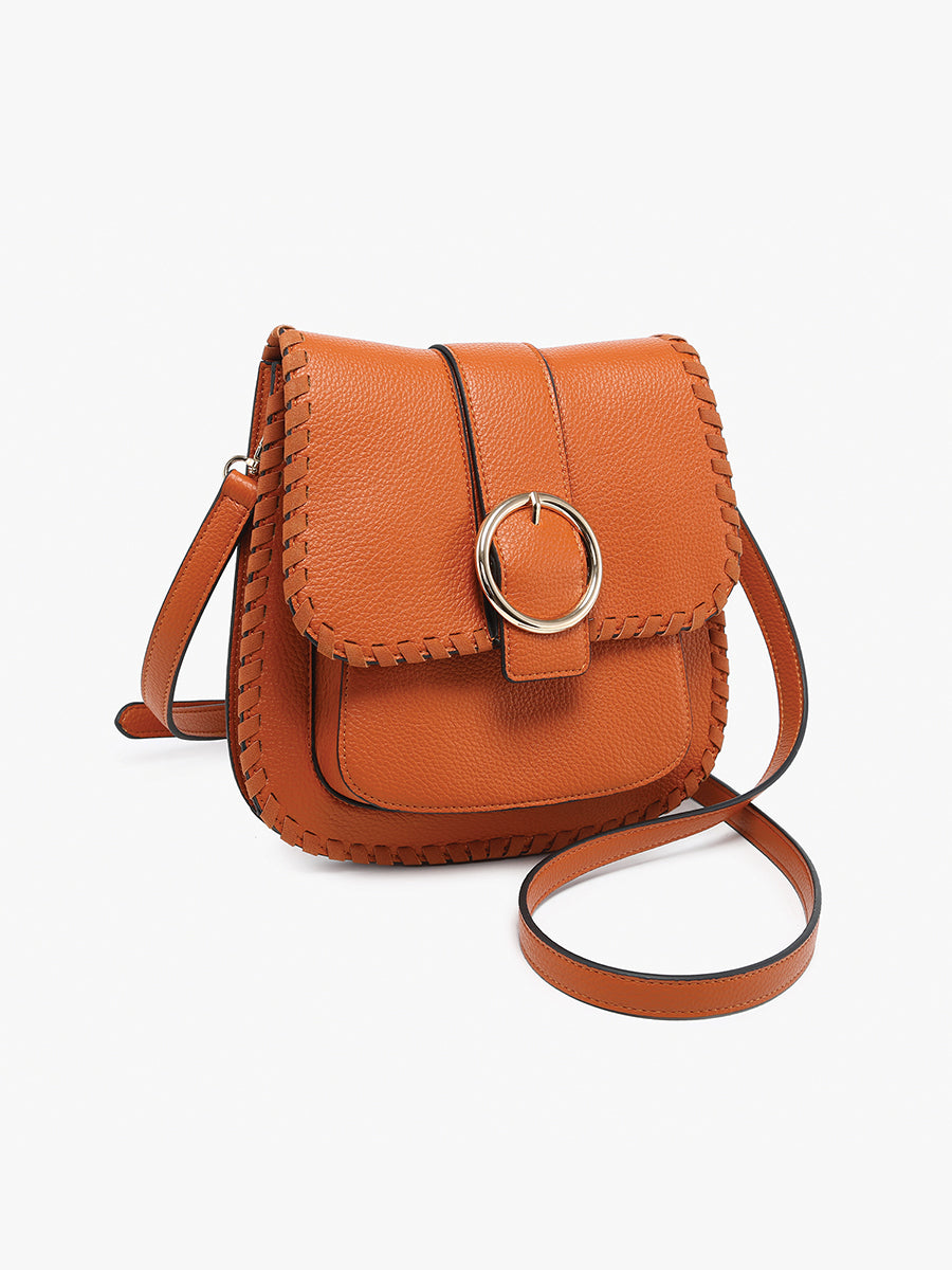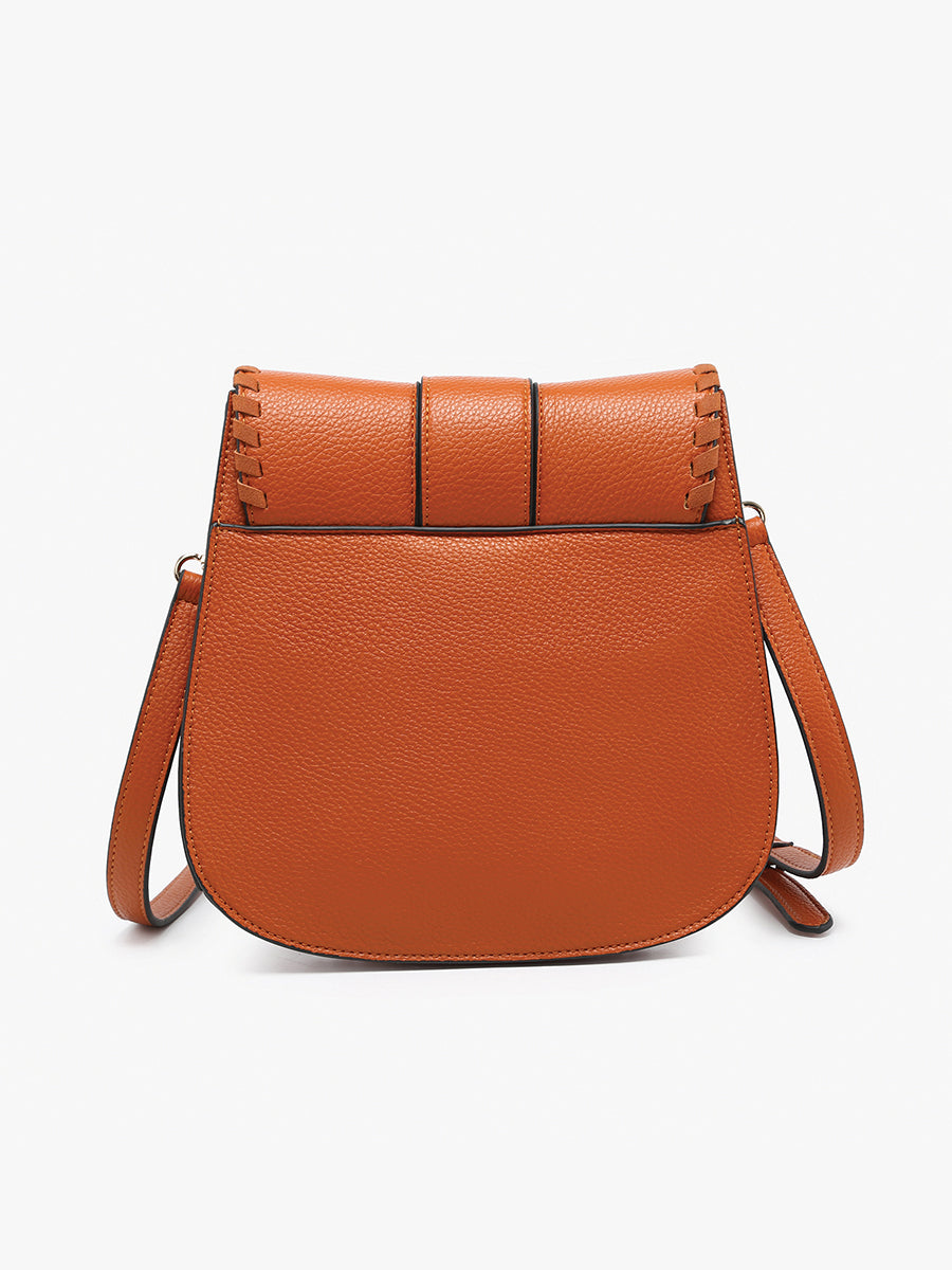 The Sandra Buckle Flapover Crossbody is a stylish and practical accessory crafted from premium vegan leather. This two-compartment saddle bag features a chic flap over snap closure with a buckle and front whipstitch trim. The adjustable and removable crossbody strap offers versatile wear, making it perfect for both casual and formal occasions.