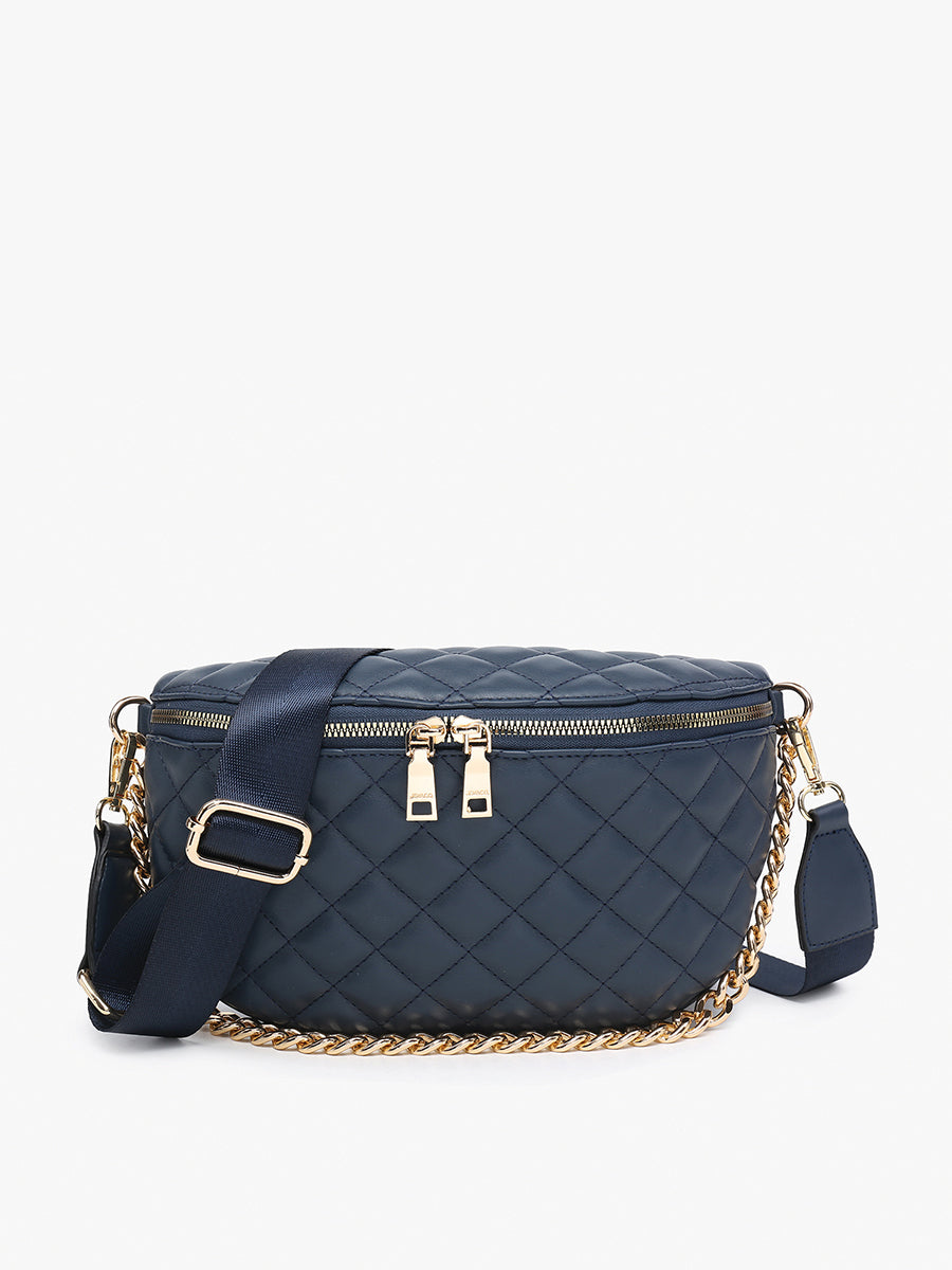 Meet Sylvie, the ultimate belt bag that combines functionality with undeniable style. Crafted to shine, Sylvie features a striking gold accent chain that adds a touch of sophistication to its quilted design. This versatile accessory is equipped with both inner and outer zip pockets, offering convenient storage for your essentials while on the go. The adjustable strap ensures a comfortable and customizable fit for any occasion. Made from premium vegan leather, Sylvie is not only fashionable but also eco-conscious. Elevate your accessory game with Sylvie and make a bold statement wherever you go.