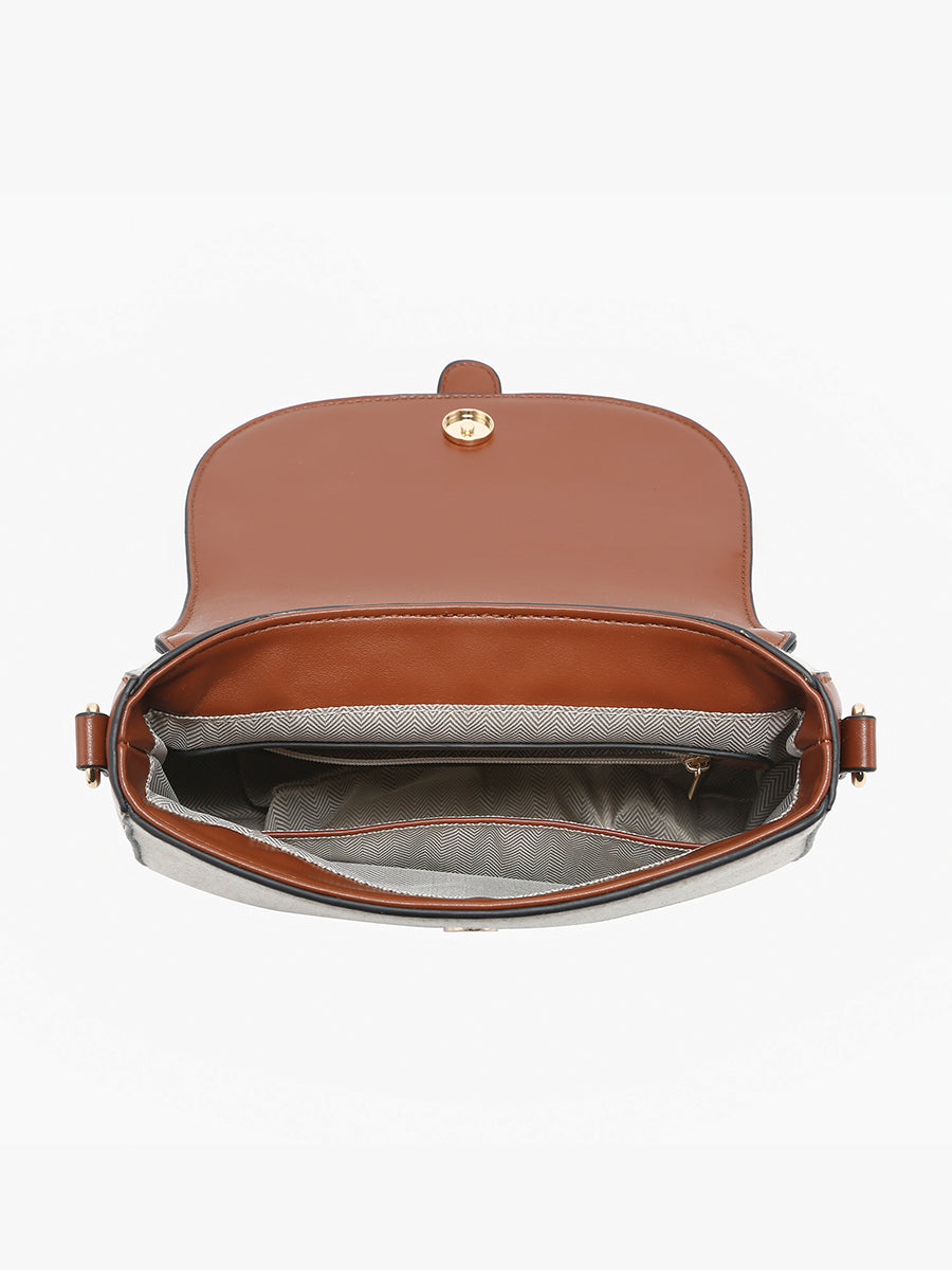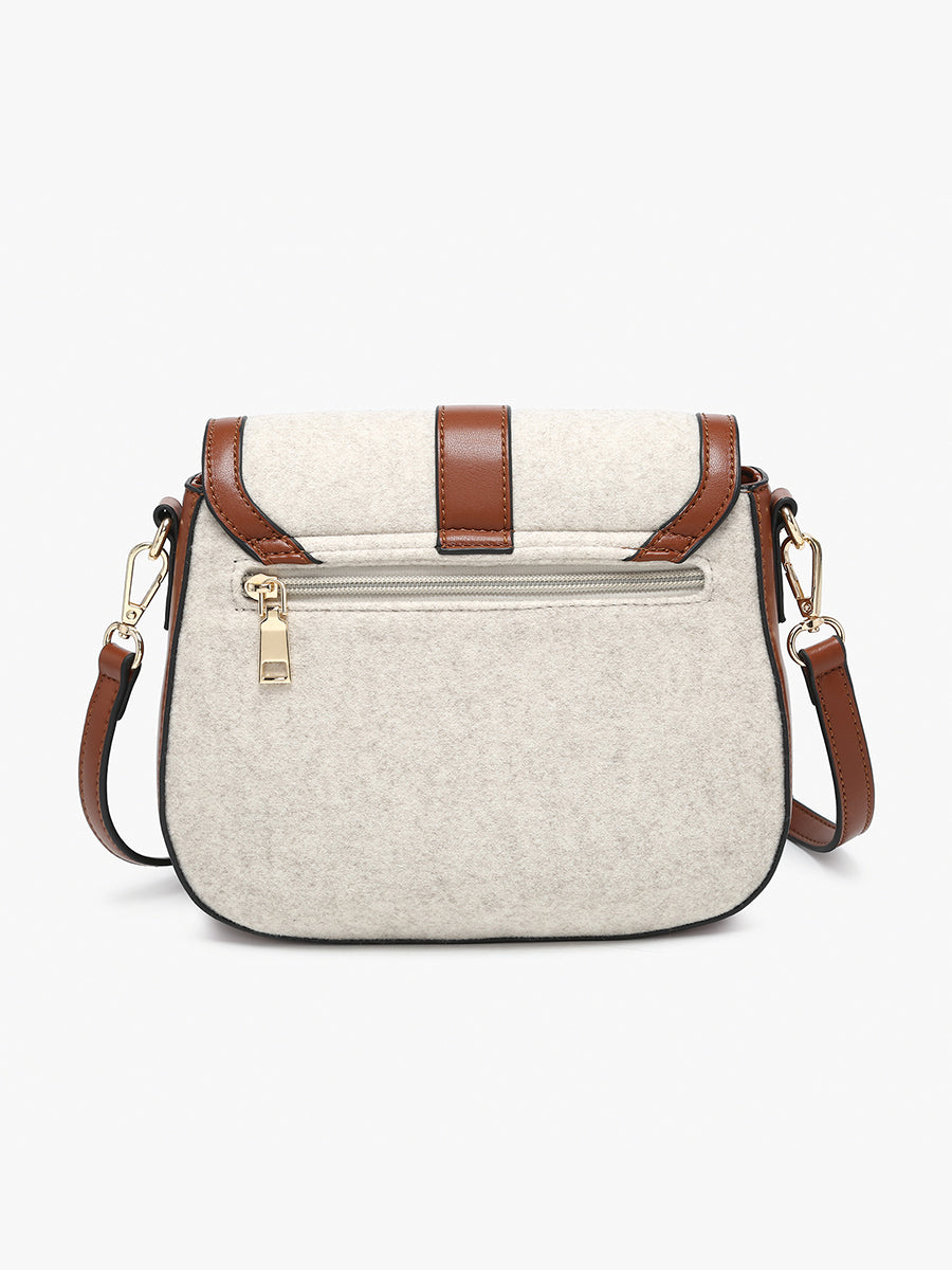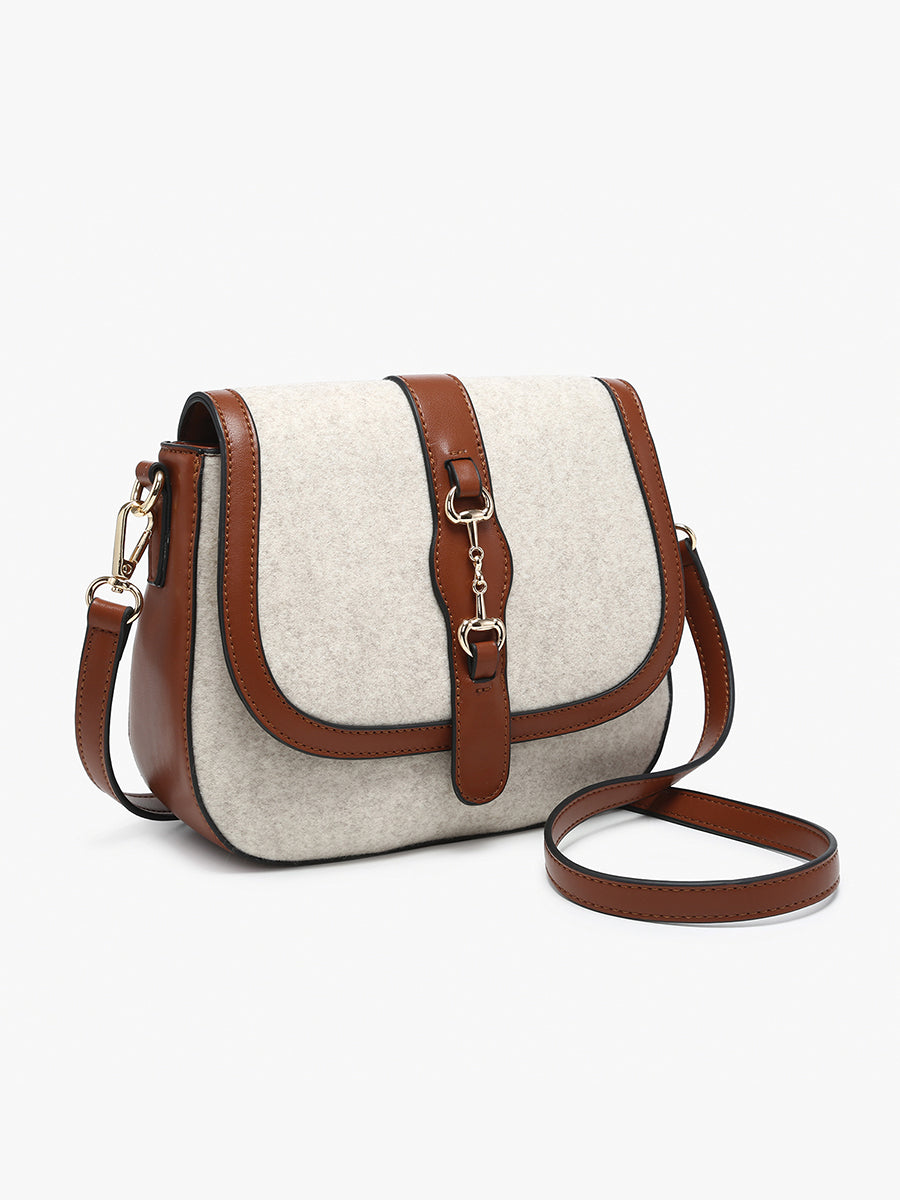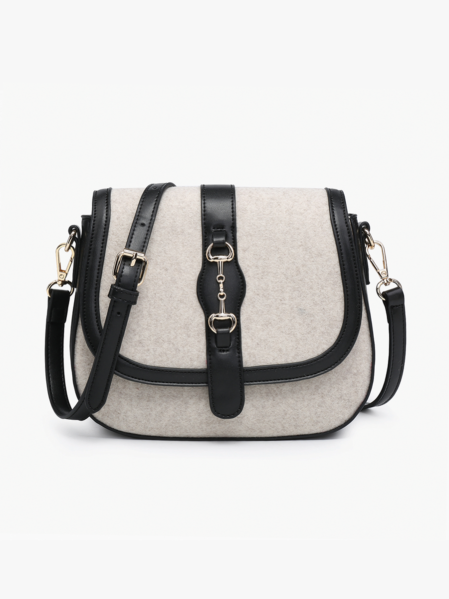 The M2588 Vanna Woven Contrast Crossbody combines sophisticated design with practical functionality. Featuring a blend of felt and vegan leather, this saddle bag is adorned with elegant horsebit detailing. It includes a secure flapover with snap closure and an adjustable, removable crossbody strap for versatile styling. A back zip pocket offers additional storage for your essentials.